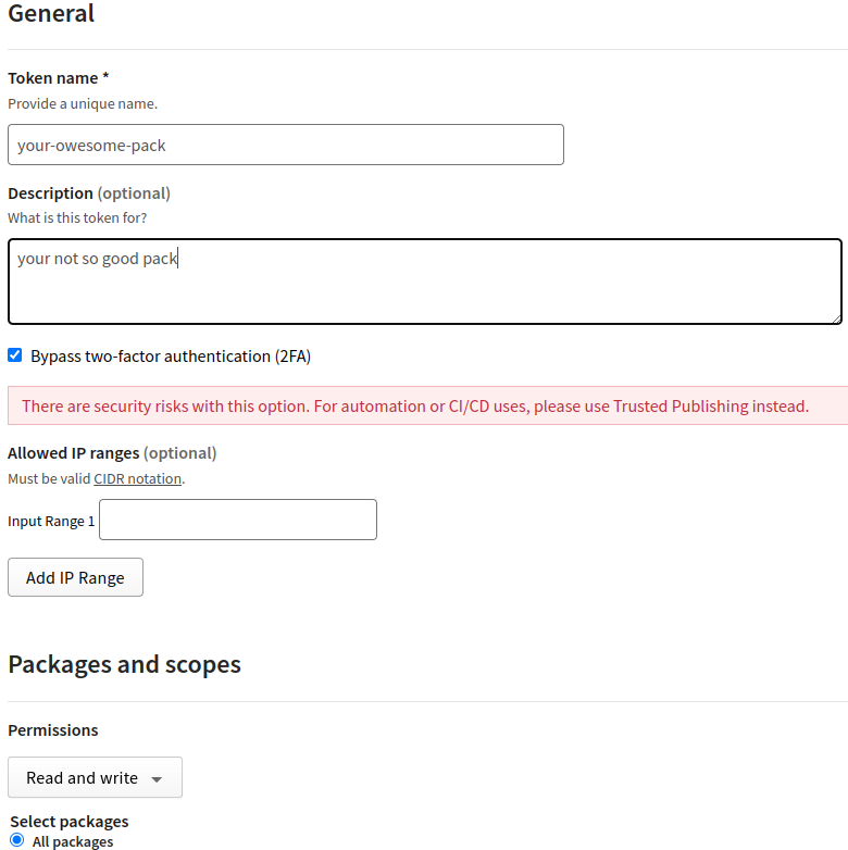 开发完毕之后,就可以发包了。但是现在所有包现在都需要双因素认证(2FA)或启用绕过 2FA 的细粒访问令牌 ,才能创建和发布包。